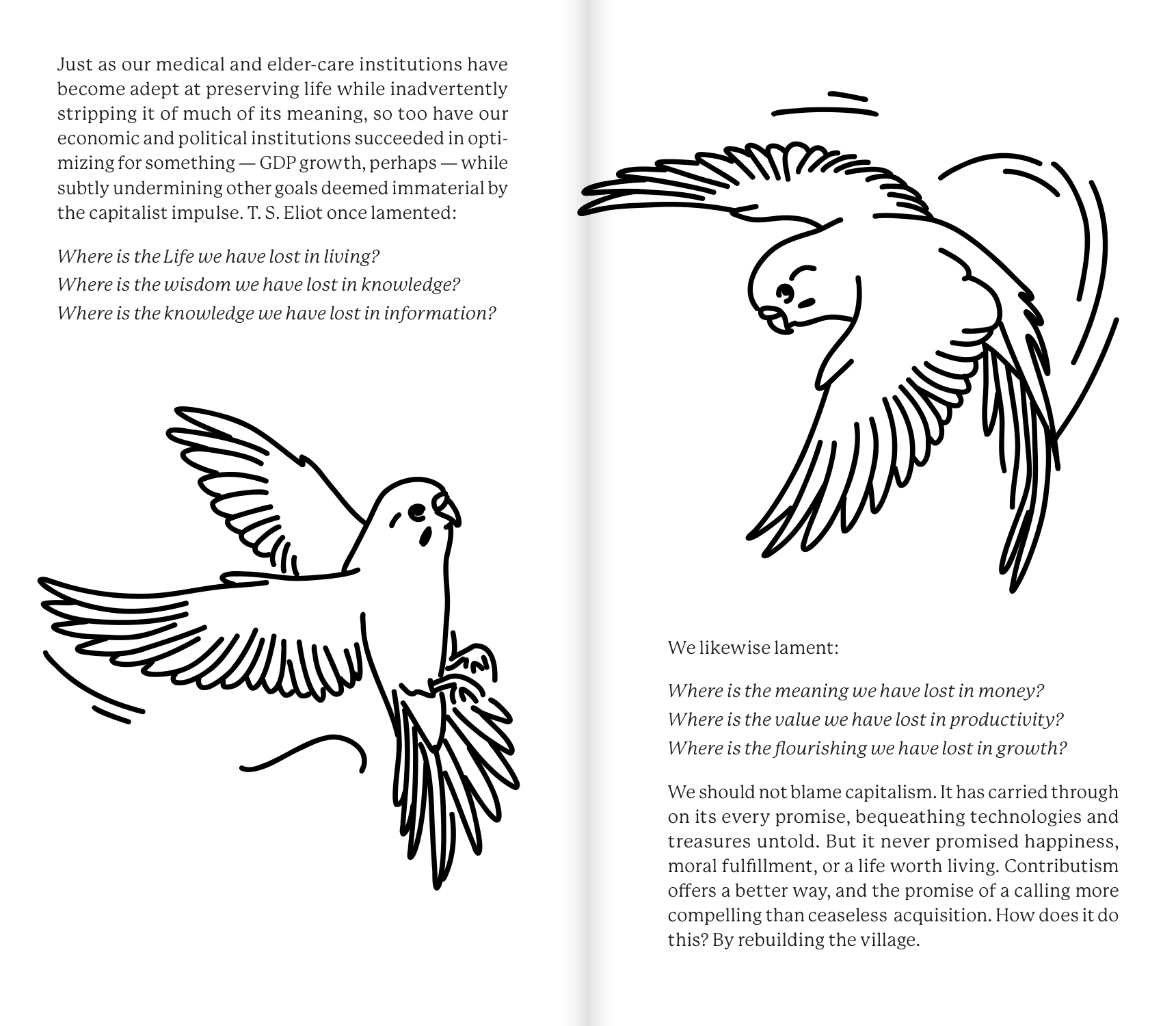 Anyway, we’ve found that, instead of trying to explain the whole thing at once, it’s most effective to just tell one piece of the story at a time, through parable, essay, and illustration. So we’re writing pamphlets – little zine-sized booklets that each capture just one aspect of contributism, in about 10-15 pages.