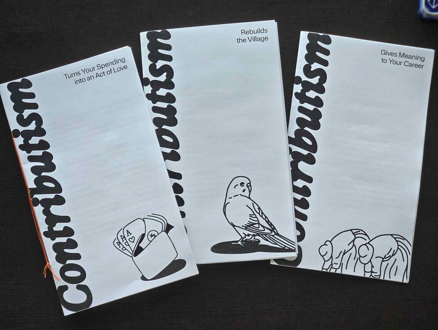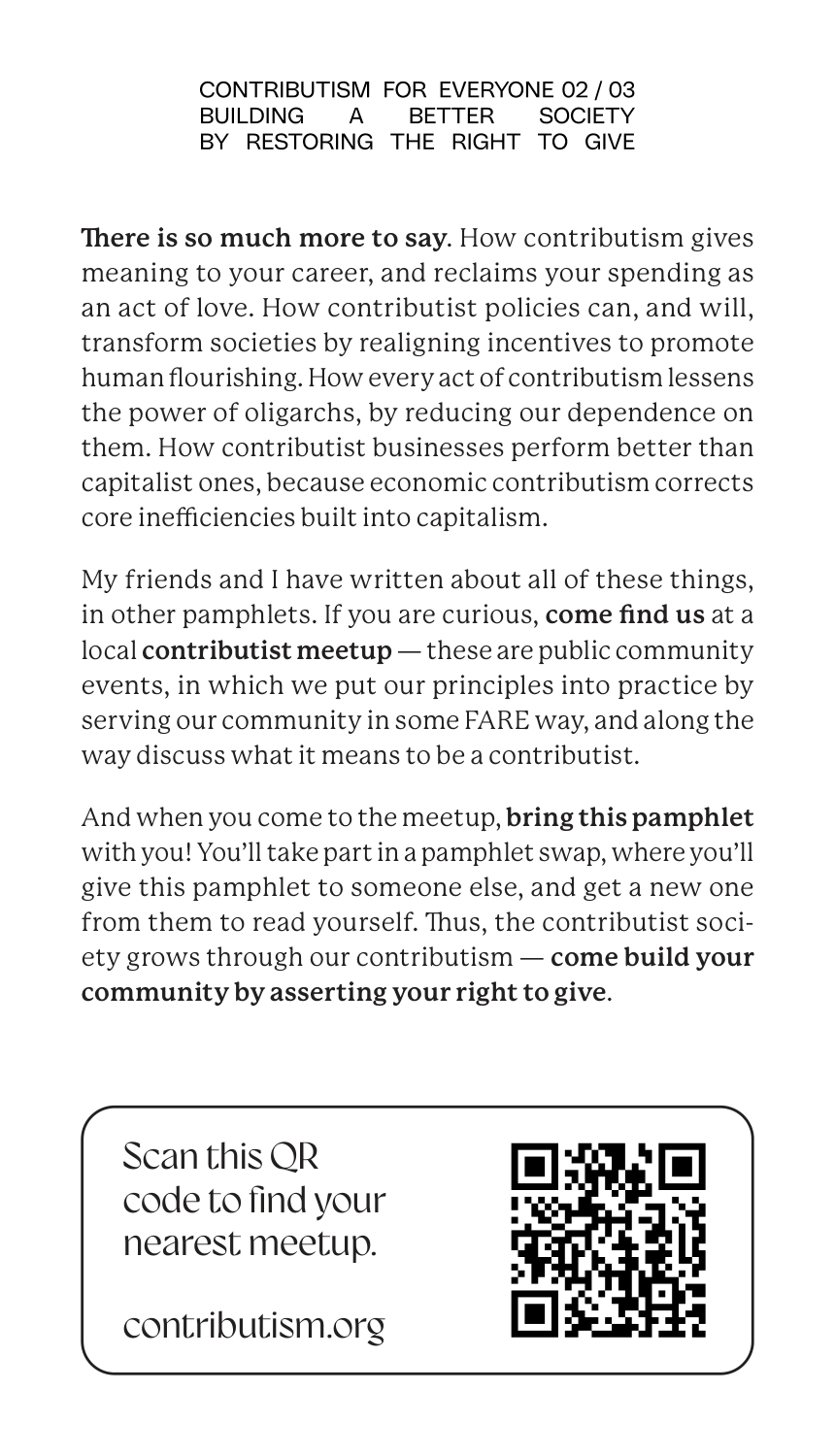 We aim to write a couple dozen of these over the next year or so, in sets of three or four, each organized around a specific topic area or target audience. We’ve started with a three-pamphlet series called Contributism for Everyone. We’ve begun distributing them for free around Stanford’s campus and in Oakland.